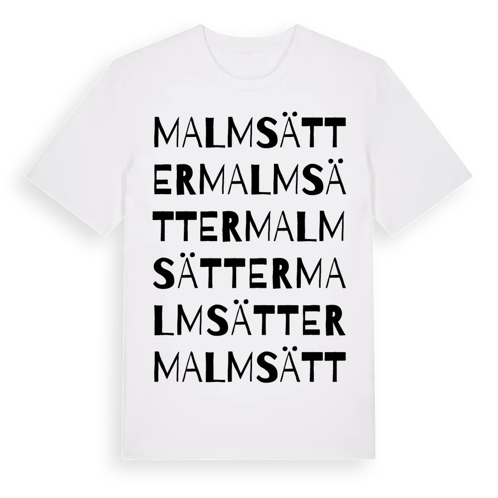 Malmsätter ordlek t-shirt är inspirerad av Malmsätter i Södermanlands län, Sverige. Tröjan är designad för dig som har en speciell koppling till platsen – oavsett om du bor här, har rötterna här eller bara älskar Malmsätter.