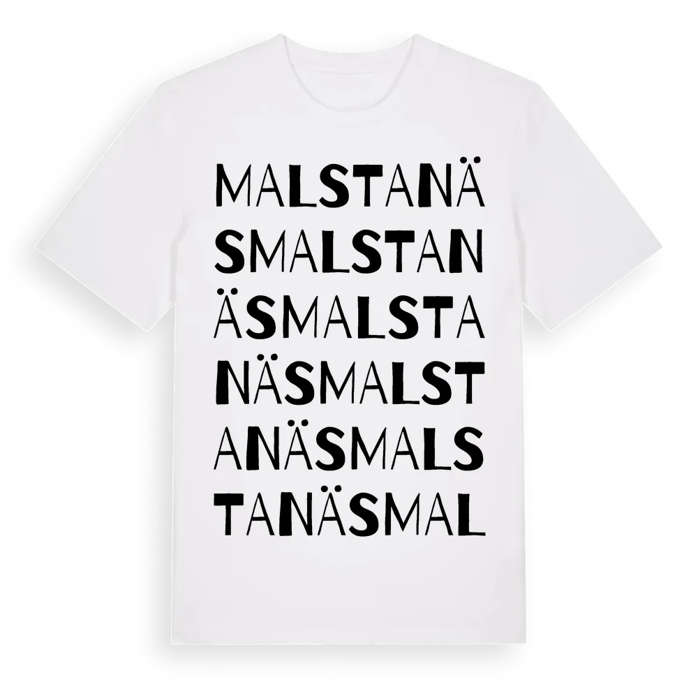 Malstanäs ordlek t-shirt är inspirerad av Malstanäs i Södermanlands län, Sverige. Tröjan är designad för dig som har en speciell koppling till platsen – oavsett om du bor här, har rötterna här eller bara älskar Malstanäs.