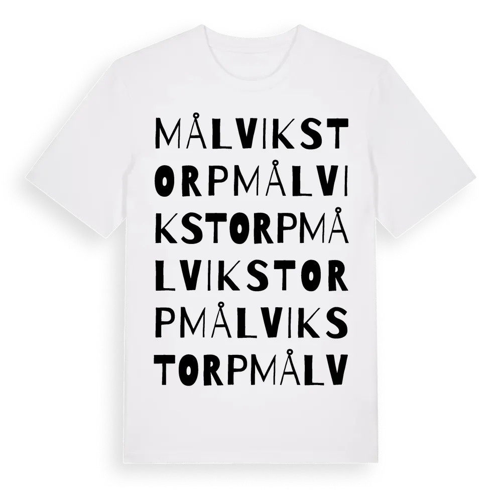 Målvikstorp ordlek t-shirt är inspirerad av Målvikstorp i Södermanlands län, Sverige. Tröjan är designad för dig som har en speciell koppling till platsen – oavsett om du bor här, har rötterna här eller bara älskar Målvikstorp.