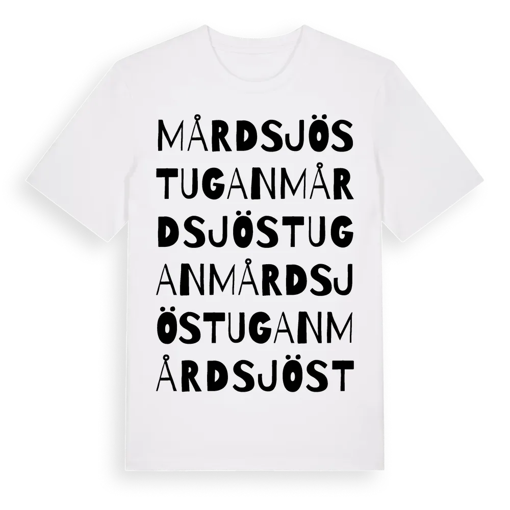 Mårdsjöstugan ordlek t-shirt är inspirerad av Mårdsjöstugan i Södermanlands län, Sverige. Tröjan är designad för dig som har en speciell koppling till platsen – oavsett om du bor här, har rötterna här eller bara älskar Mårdsjöstugan.