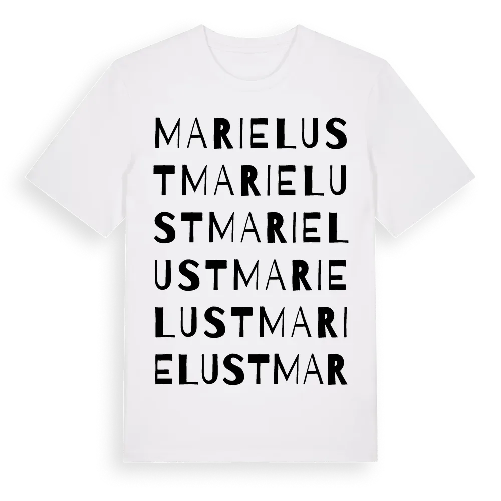 Marielust ordlek t-shirt är inspirerad av Marielust i Södermanlands län, Sverige. Tröjan är designad för dig som har en speciell koppling till platsen – oavsett om du bor här, har rötterna här eller bara älskar Marielust.