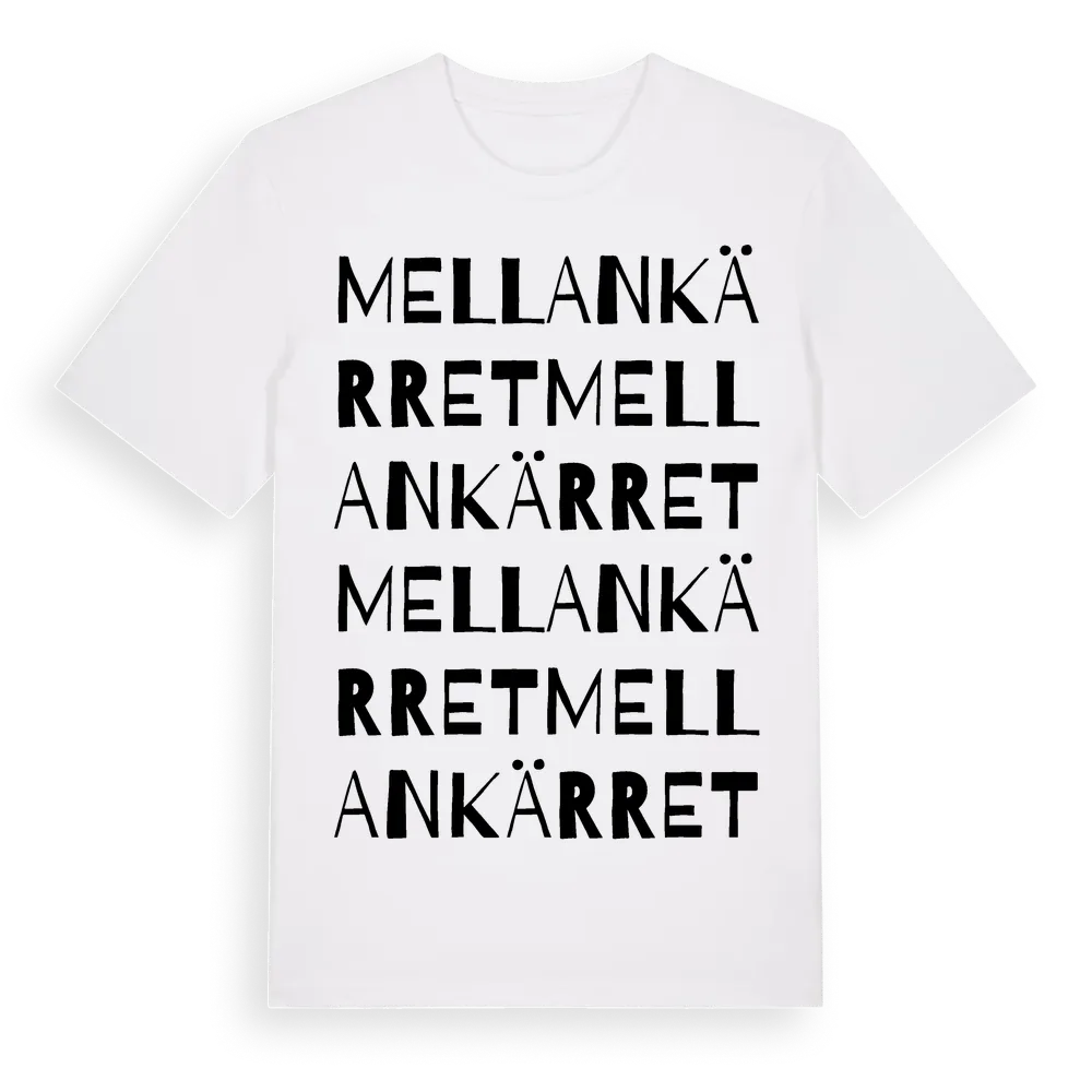Mellankärret ordlek t-shirt är inspirerad av Mellankärret i Södermanlands län, Sverige. Tröjan är designad för dig som har en speciell koppling till platsen – oavsett om du bor här, har rötterna här eller bara älskar Mellankärret.