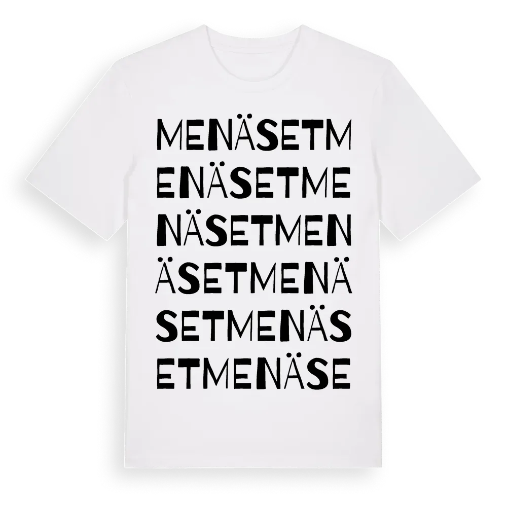 En ordlek byggd på Menäsets namn. Subtilt och klurig – ett motiv som bara de som verkligen känner platsen fullt ut förstår. Premium bomull, unisex – från Menäset i Södermanlands län.