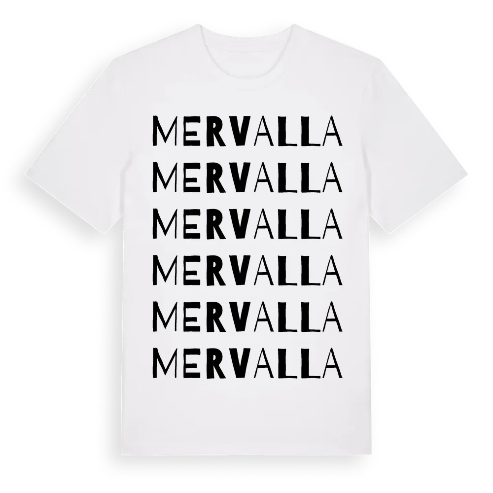 Mervalla ordlek t-shirt är inspirerad av Mervalla i Södermanlands län, Sverige. Tröjan är designad för dig som har en speciell koppling till platsen – oavsett om du bor här, har rötterna här eller bara älskar Mervalla.
