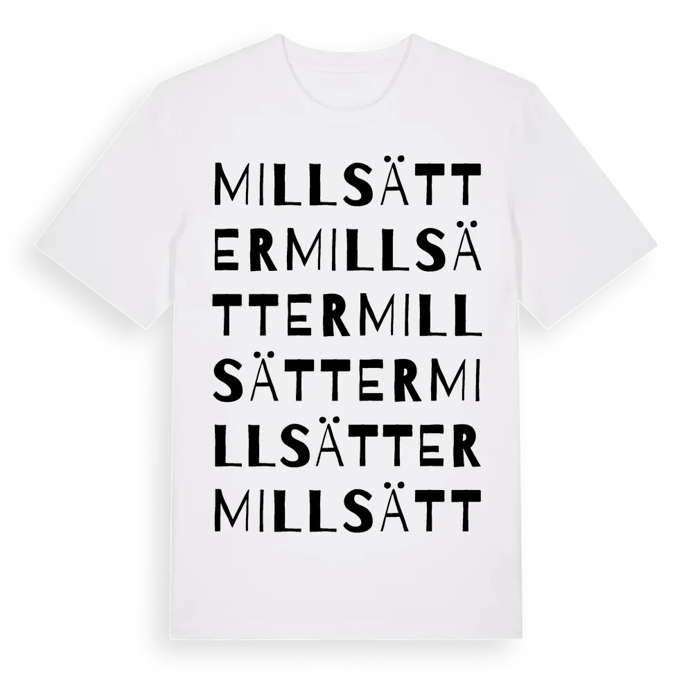 Millsätter ordlek t-shirt är inspirerad av Millsätter i Södermanlands län, Sverige. Tröjan är designad för dig som har en speciell koppling till platsen – oavsett om du bor här, har rötterna här eller bara älskar Millsätter.