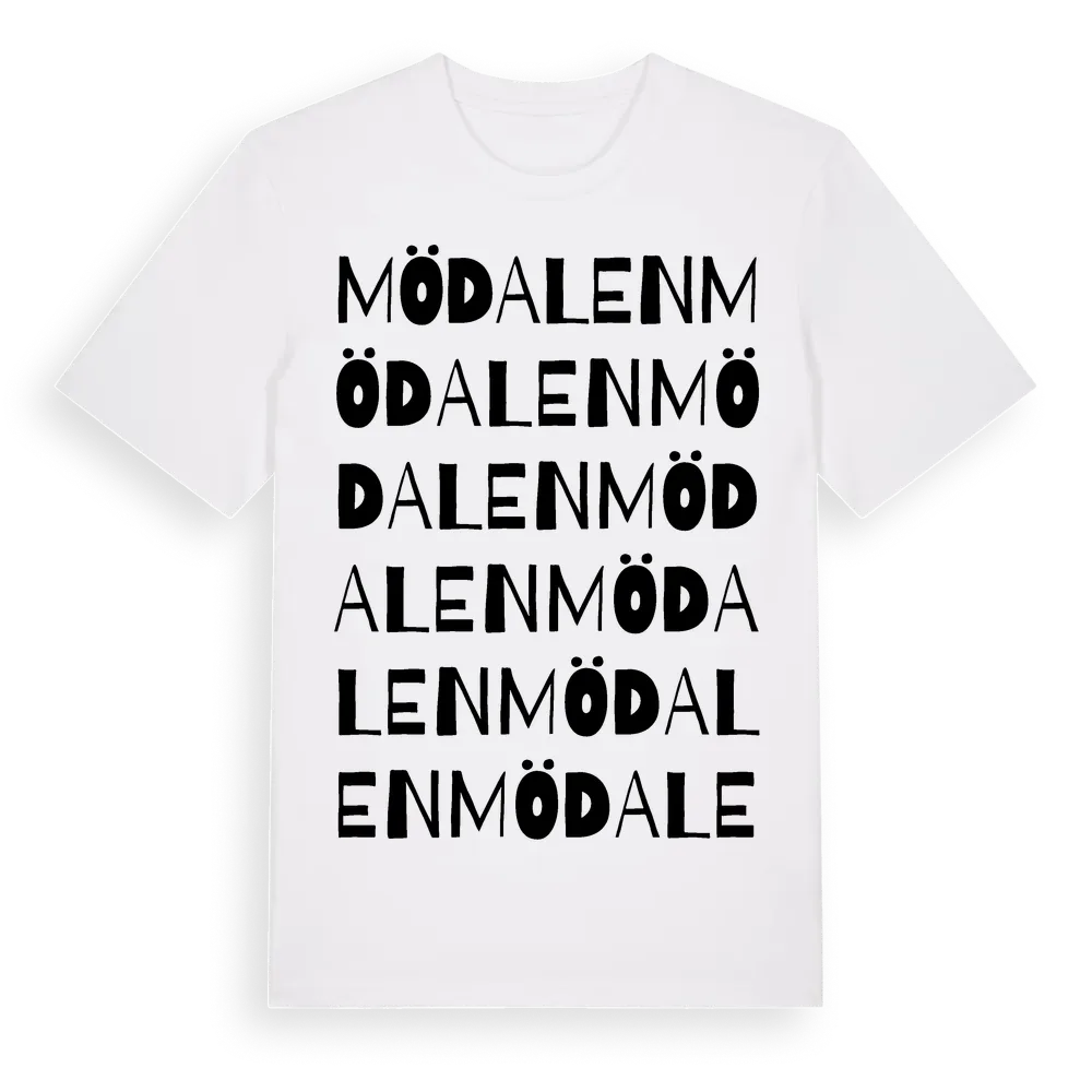 Mödalen ordlek t-shirt är inspirerad av Mödalen i Södermanlands län, Sverige. Tröjan är designad för dig som har en speciell koppling till platsen – oavsett om du bor här, har rötterna här eller bara älskar Mödalen.