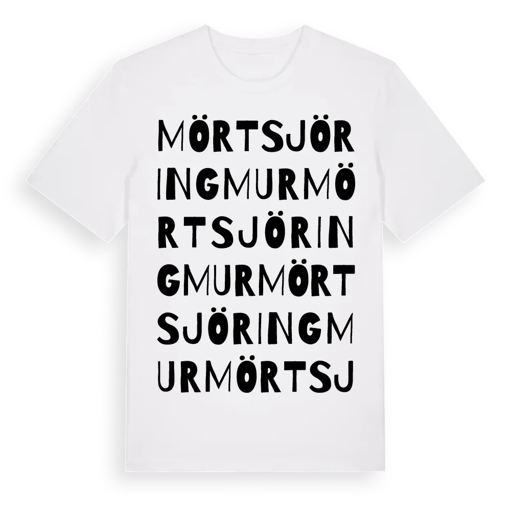 Mörtsjö Ringmur ordlek t-shirt är inspirerad av Mörtsjö Ringmur i Södermanlands län, Sverige. Tröjan är designad för dig som har en speciell koppling till platsen – oavsett om du bor här, har rötterna här eller bara älskar Mörtsjö Ringmur.