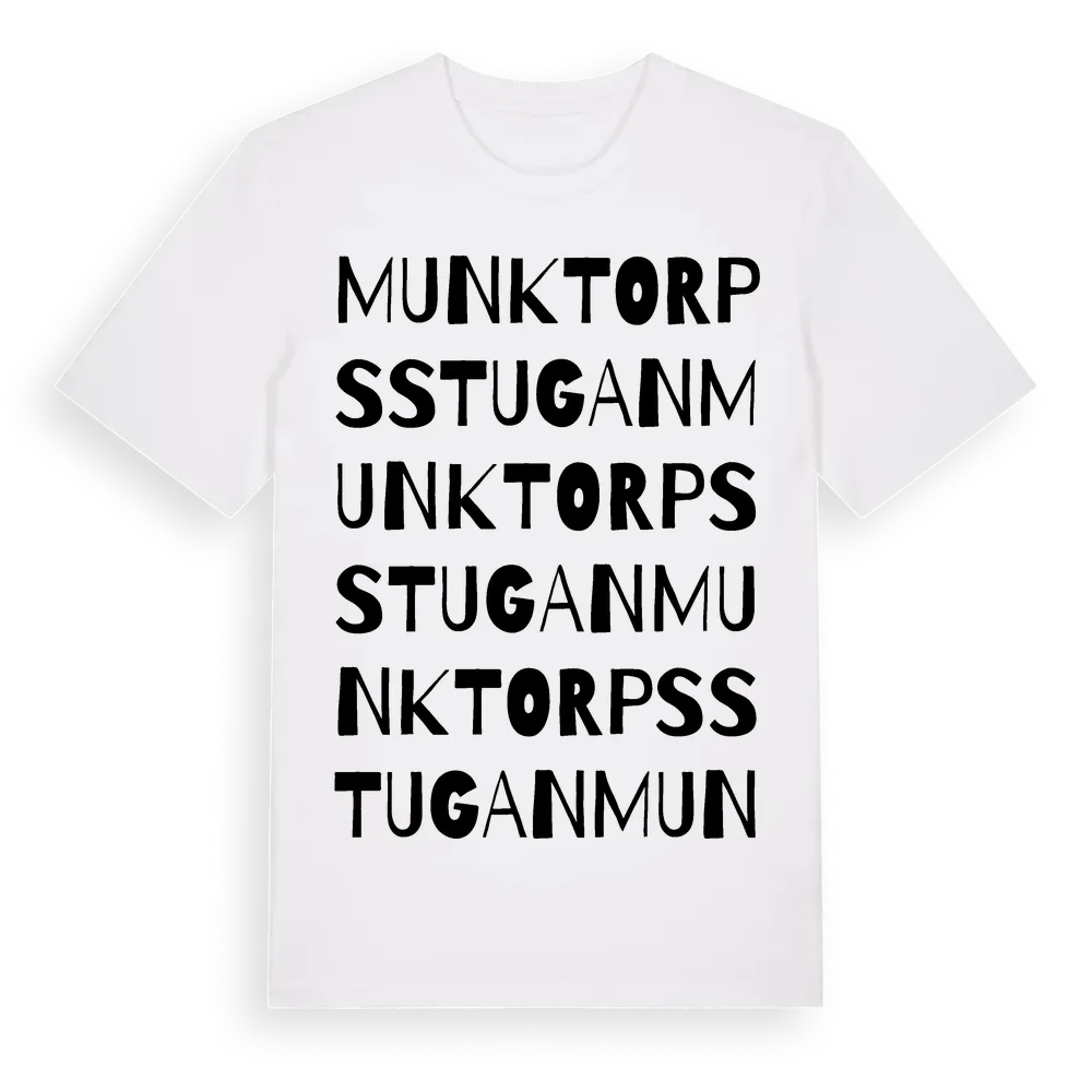 Munktorpsstugan ordlek t-shirt är inspirerad av Munktorpsstugan i Södermanlands län, Sverige. Tröjan är designad för dig som har en speciell koppling till platsen – oavsett om du bor här, har rötterna här eller bara älskar Munktorpsstugan.