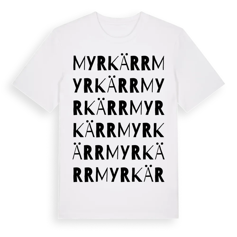 Myrkärr ordlek t-shirt är inspirerad av Myrkärr i Södermanlands län, Sverige. Tröjan är designad för dig som har en speciell koppling till platsen – oavsett om du bor här, har rötterna här eller bara älskar Myrkärr.
