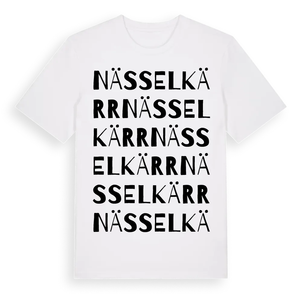 Nässelkärr ordlek t-shirt är inspirerad av Nässelkärr i Södermanlands län, Sverige. Tröjan är designad för dig som har en speciell koppling till platsen – oavsett om du bor här, har rötterna här eller bara älskar Nässelkärr.