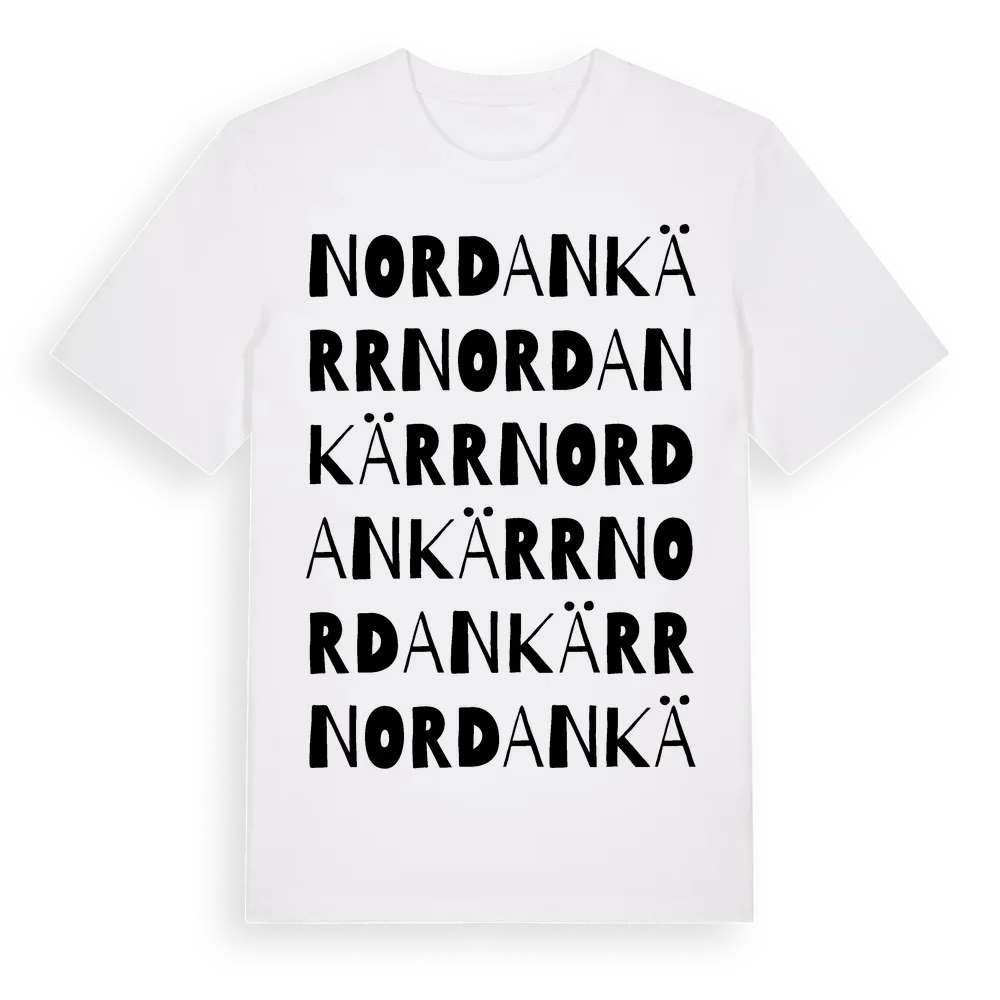 Nordankärr ordlek t-shirt är inspirerad av Nordankärr i Södermanlands län, Sverige. Tröjan är designad för dig som har en speciell koppling till platsen – oavsett om du bor här, har rötterna här eller bara älskar Nordankärr.