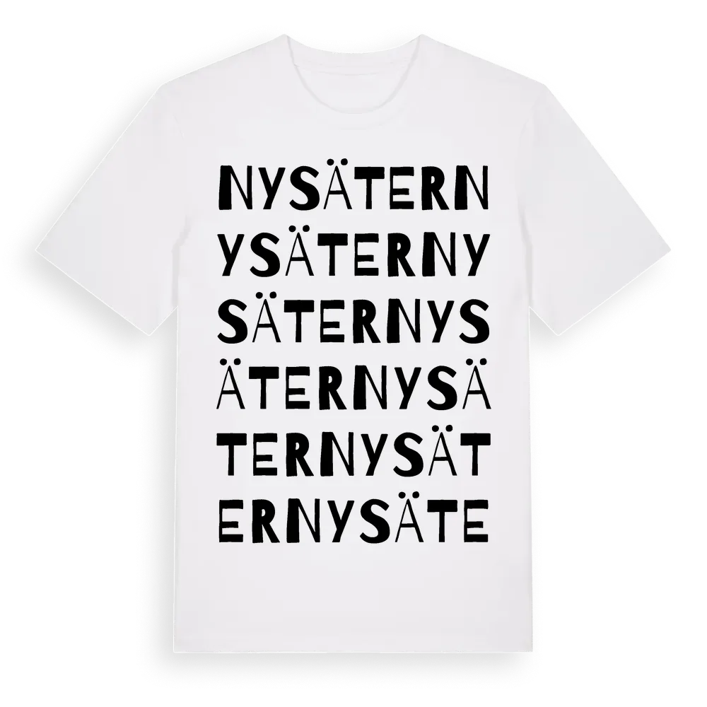 Nysäter ordlek t-shirt är inspirerad av Nysäter i Södermanlands län, Sverige. Tröjan är designad för dig som har en speciell koppling till platsen – oavsett om du bor här, har rötterna här eller bara älskar Nysäter.