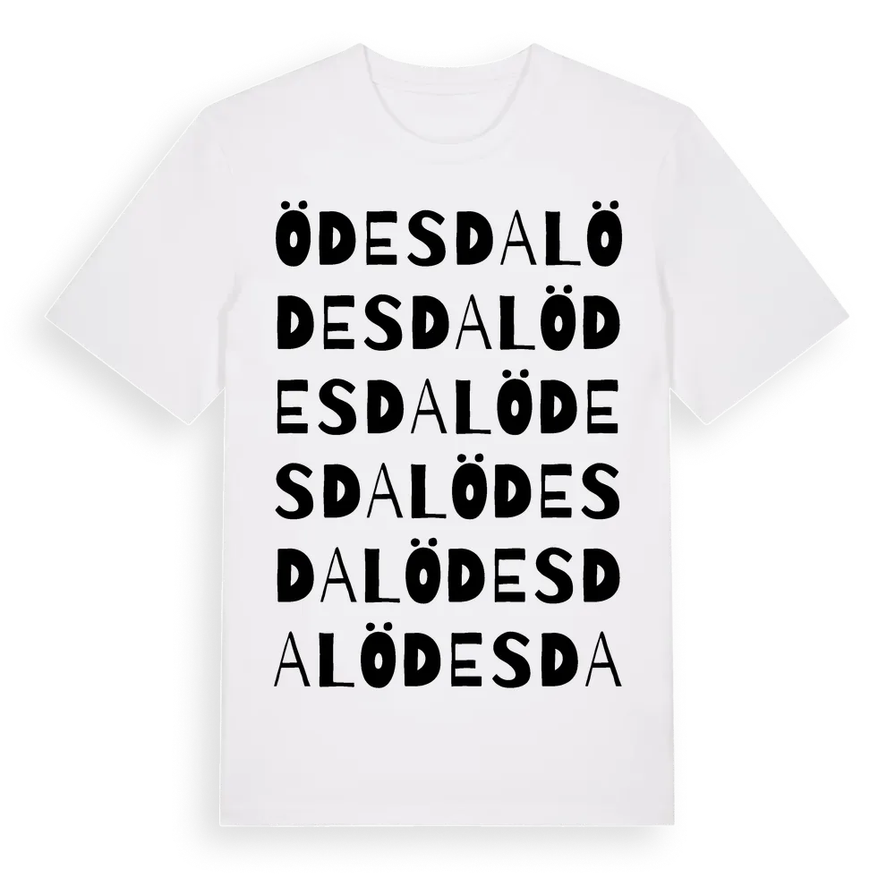 Ödesdal ordlek t-shirt är inspirerad av Ödesdal i Södermanlands län, Sverige. Tröjan är designad för dig som har en speciell koppling till platsen – oavsett om du bor här, har rötterna här eller bara älskar Ödesdal.