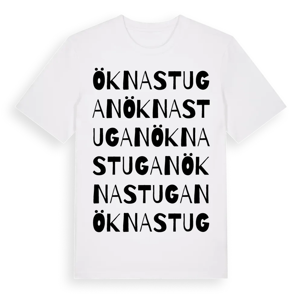 Öknastugan ordlek t-shirt är inspirerad av Öknastugan i Södermanlands län, Sverige. Tröjan är designad för dig som har en speciell koppling till platsen – oavsett om du bor här, har rötterna här eller bara älskar Öknastugan.