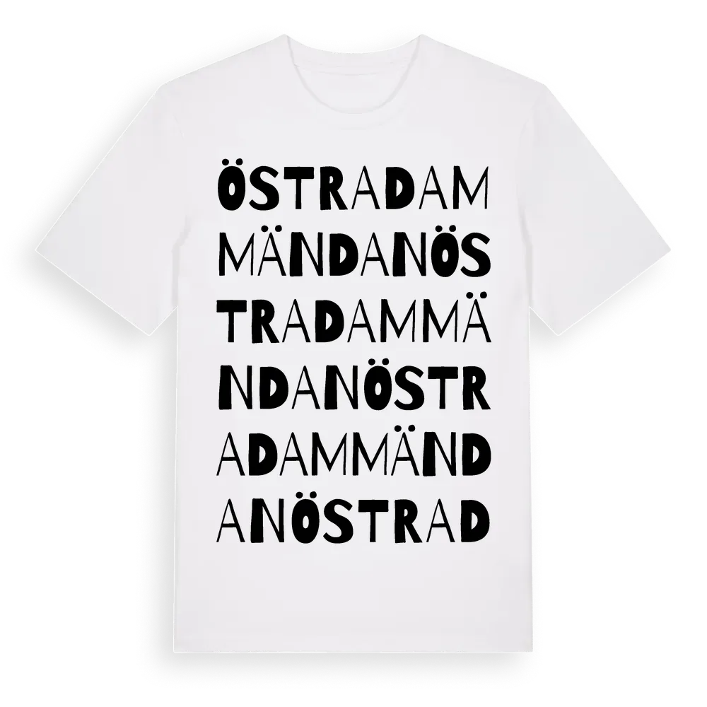 Östra Dammändan ordlek t-shirt är inspirerad av Östra Dammändan i Södermanlands län, Sverige. Tröjan är designad för dig som har en speciell koppling till platsen – oavsett om du bor här, har rötterna här eller bara älskar Östra Dammändan.