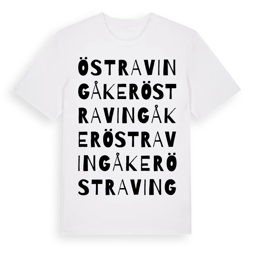 Östra Vingåker ordlek t-shirt är inspirerad av byn Östra Vingåker i Södermanlands län, Sverige. Tröjan är designad för dig som har en speciell koppling till platsen – oavsett om du bor här, har rötterna här eller bara älskar Östra Vingåker.