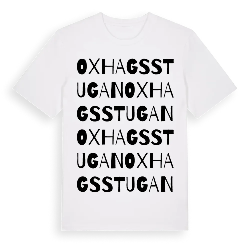 Oxhagsstugan ordlek t-shirt är inspirerad av Oxhagsstugan i Södermanlands län, Sverige. Tröjan är designad för dig som har en speciell koppling till platsen – oavsett om du bor här, har rötterna här eller bara älskar Oxhagsstugan.