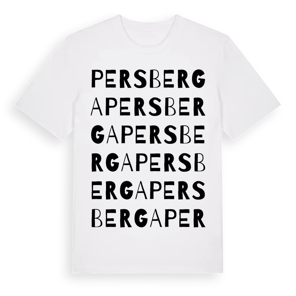 Persberga ordlek t-shirt är inspirerad av Persberga i Södermanlands län, Sverige. Tröjan är designad för dig som har en speciell koppling till platsen – oavsett om du bor här, har rötterna här eller bara älskar Persberga.