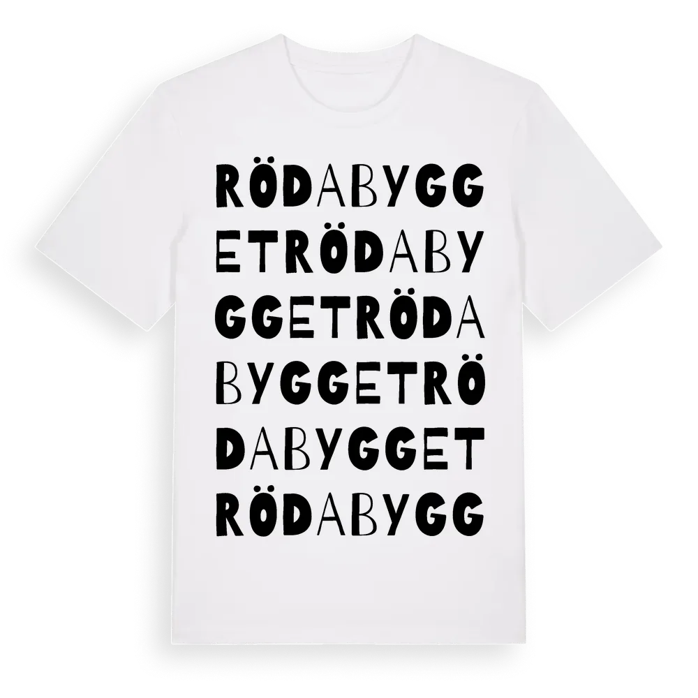 Röda Bygget ordlek t-shirt är inspirerad av Röda Bygget i Södermanlands län, Sverige. Tröjan är designad för dig som har en speciell koppling till platsen – oavsett om du bor här, har rötterna här eller bara älskar Röda Bygget.