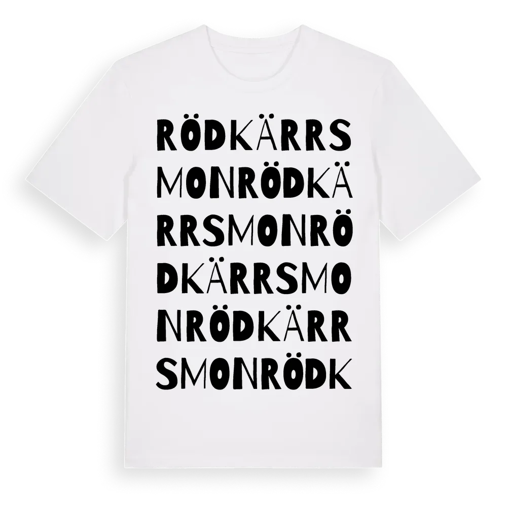 Rödkärrsmon ordlek t-shirt är inspirerad av Rödkärrsmon i Södermanlands län, Sverige. Tröjan är designad för dig som har en speciell koppling till platsen – oavsett om du bor här, har rötterna här eller bara älskar Rödkärrsmon.
