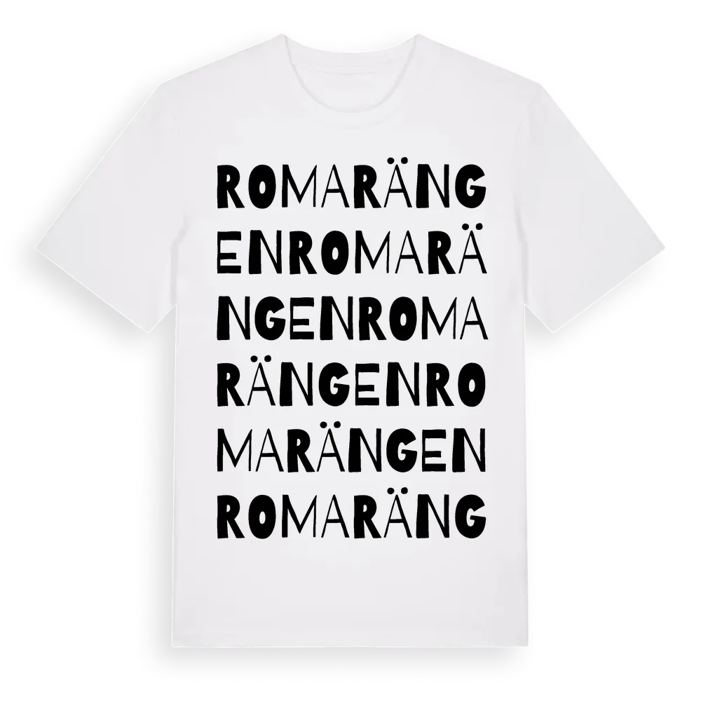 Romarängen ordlek t-shirt är inspirerad av Romarängen i Södermanlands län, Sverige. Tröjan är designad för dig som har en speciell koppling till platsen – oavsett om du bor här, har rötterna här eller bara älskar Romarängen.
