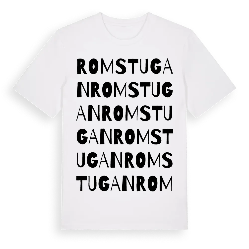 Romstugan ordlek t-shirt är inspirerad av Romstugan i Södermanlands län, Sverige. Tröjan är designad för dig som har en speciell koppling till platsen – oavsett om du bor här, har rötterna här eller bara älskar Romstugan.