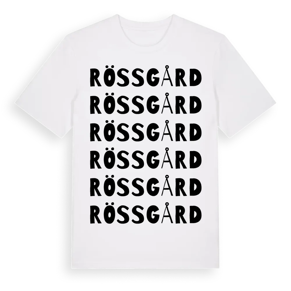 Rössgård ordlek t-shirt är inspirerad av Rössgård i Södermanlands län, Sverige. Tröjan är designad för dig som har en speciell koppling till platsen – oavsett om du bor här, har rötterna här eller bara älskar Rössgård.