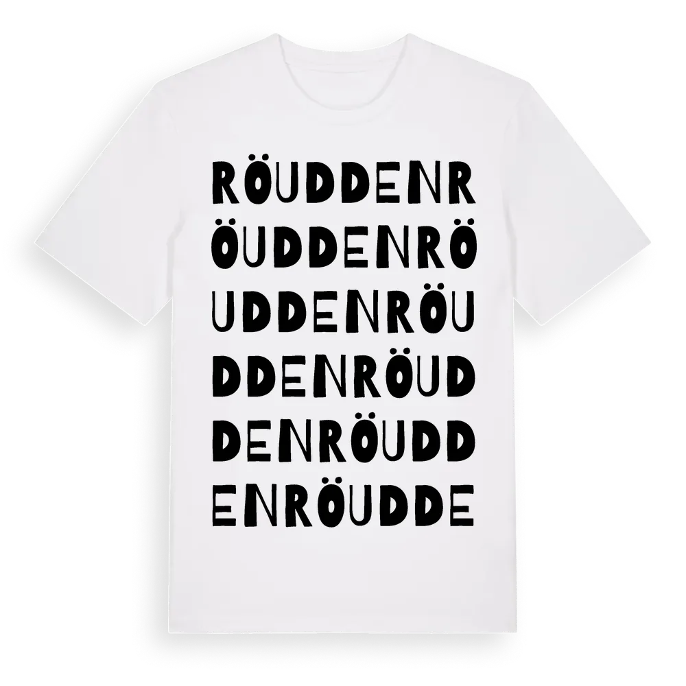 En ordlek byggd på Röuddens namn. Subtilt och klurig – ett motiv som bara de som verkligen känner platsen fullt ut förstår. Premium bomull, unisex – från Röudden i Södermanlands län.