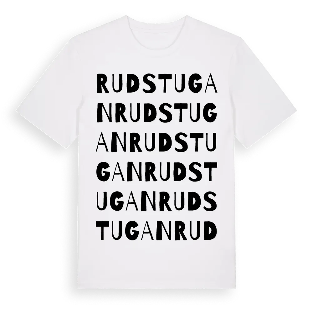 Rudstugan ordlek t-shirt är inspirerad av Rudstugan i Södermanlands län, Sverige. Tröjan är designad för dig som har en speciell koppling till platsen – oavsett om du bor här, har rötterna här eller bara älskar Rudstugan.