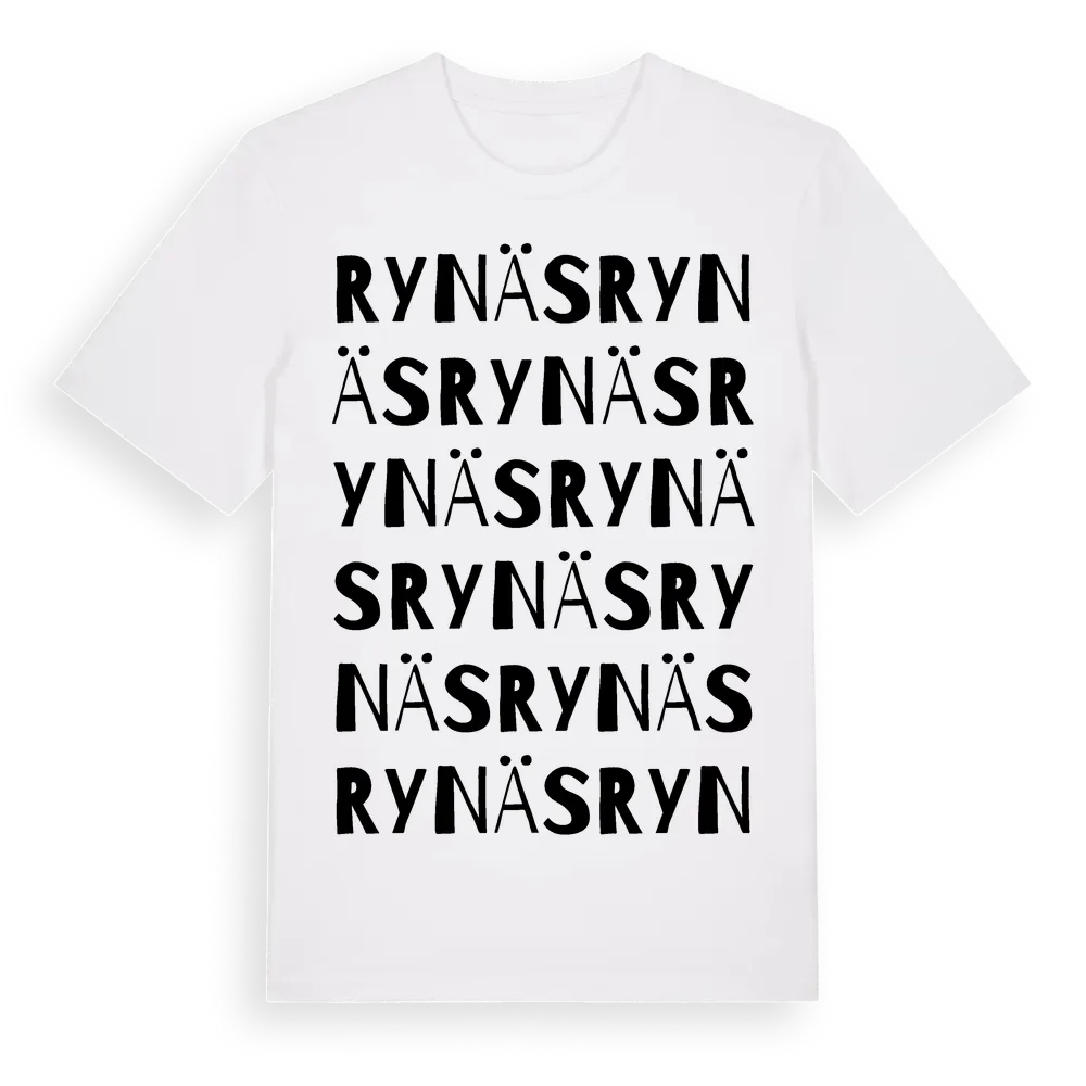 En ordlek byggd på Rynäss namn. Subtilt och klurig – ett motiv som bara de som verkligen känner platsen fullt ut förstår. Premium bomull, unisex – från byn Rynäs i Södermanlands län.