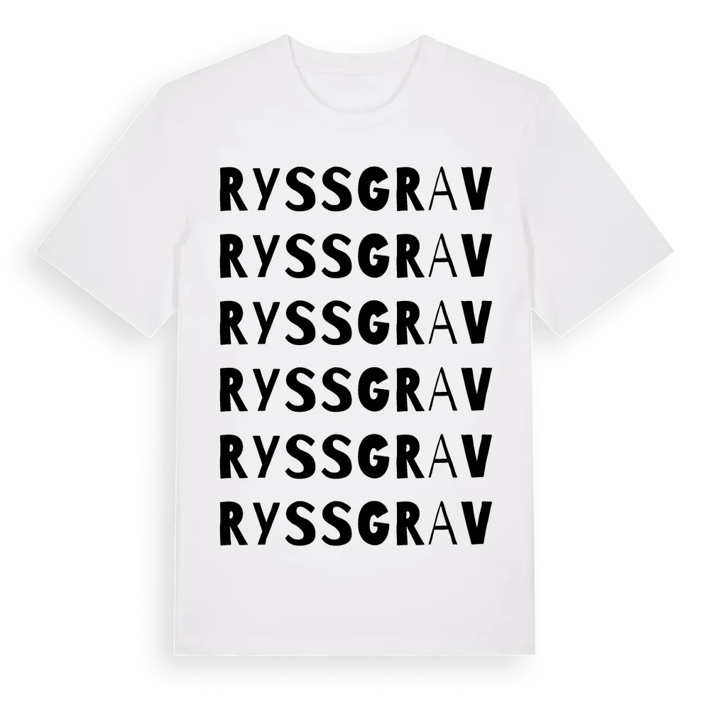 En ordlek byggd på Ryssgravs namn. Subtilt och klurig – ett motiv som bara de som verkligen känner platsen fullt ut förstår. Premium bomull, unisex – från Ryssgrav i Södermanlands län.