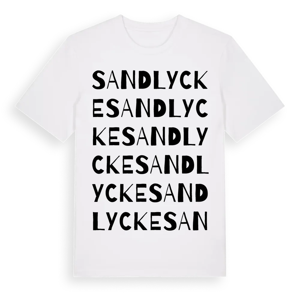Sandlycke ordlek t-shirt är inspirerad av Sandlycke i Södermanlands län, Sverige. Tröjan är designad för dig som har en speciell koppling till platsen – oavsett om du bor här, har rötterna här eller bara älskar Sandlycke.