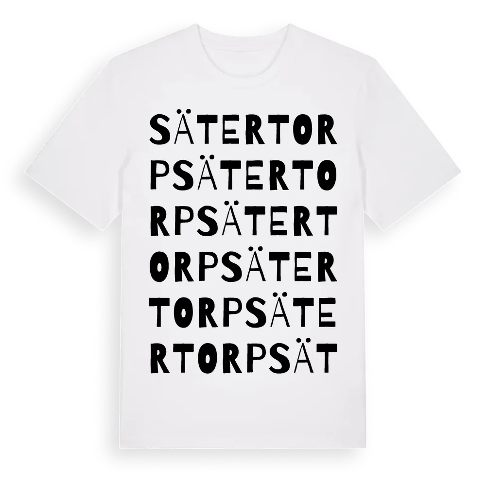 Sätertorp ordlek t-shirt är inspirerad av Sätertorp i Södermanlands län, Sverige. Tröjan är designad för dig som har en speciell koppling till platsen – oavsett om du bor här, har rötterna här eller bara älskar Sätertorp.