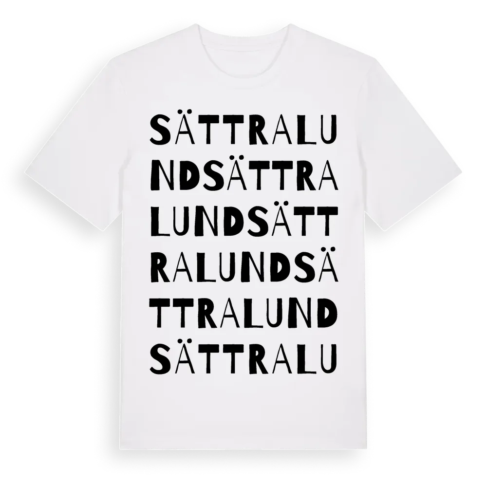 Sättralund ordlek t-shirt är inspirerad av Sättralund i Södermanlands län, Sverige. Tröjan är designad för dig som har en speciell koppling till platsen – oavsett om du bor här, har rötterna här eller bara älskar Sättralund.