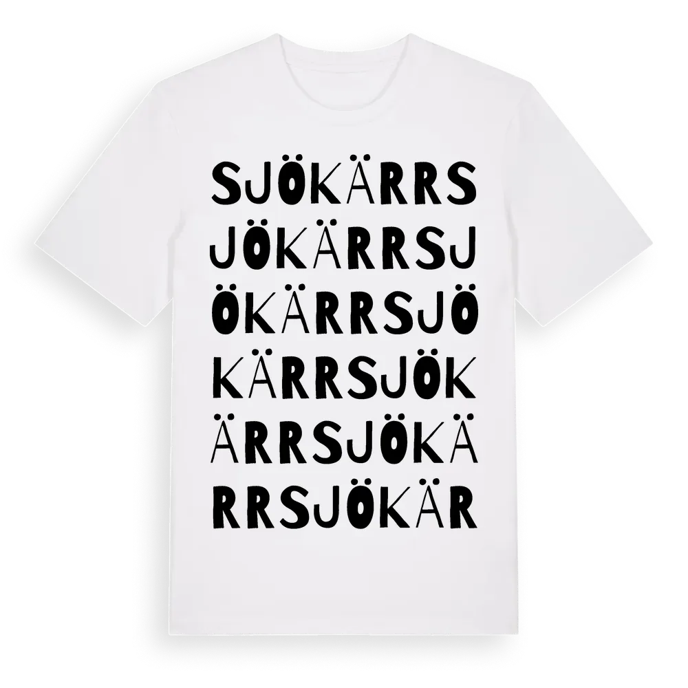 Sjökärr ordlek t-shirt är inspirerad av byn Sjökärr i Södermanlands län, Sverige. Tröjan är designad för dig som har en speciell koppling till platsen – oavsett om du bor här, har rötterna här eller bara älskar Sjökärr.