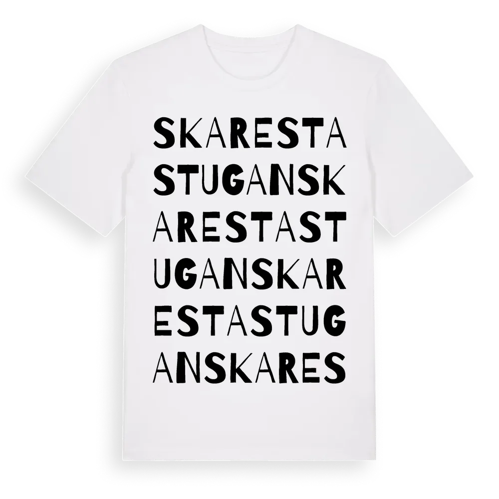 Skarestastugan ordlek t-shirt är inspirerad av byn Skarestastugan i Södermanlands län, Sverige. Tröjan är designad för dig som har en speciell koppling till platsen – oavsett om du bor här, har rötterna här eller bara älskar Skarestastugan.
