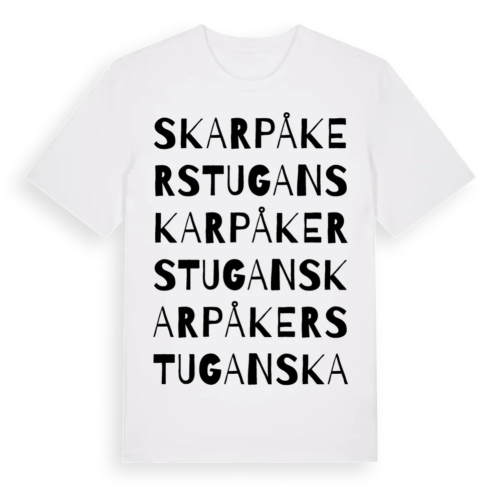 Skarpåkerstugan ordlek t-shirt är inspirerad av Skarpåkerstugan i Södermanlands län, Sverige. Tröjan är designad för dig som har en speciell koppling till platsen – oavsett om du bor här, har rötterna här eller bara älskar Skarpåkerstugan.