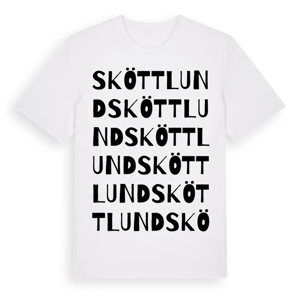 Sköttlund ordlek t-shirt är inspirerad av Sköttlund i Södermanlands län, Sverige. Tröjan är designad för dig som har en speciell koppling till platsen – oavsett om du bor här, har rötterna här eller bara älskar Sköttlund.