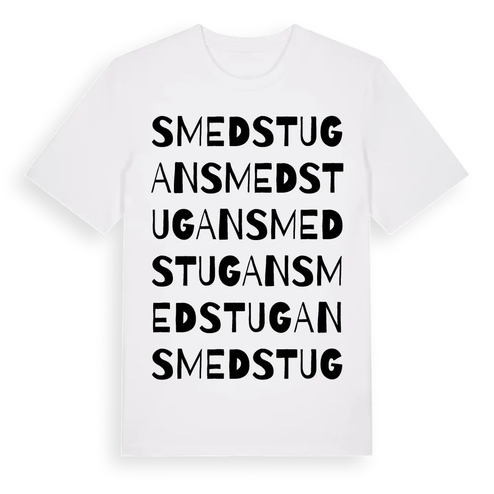 Smedstugan ordlek t-shirt är inspirerad av Smedstugan i Södermanlands län, Sverige. Tröjan är designad för dig som har en speciell koppling till platsen – oavsett om du bor här, har rötterna här eller bara älskar Smedstugan.