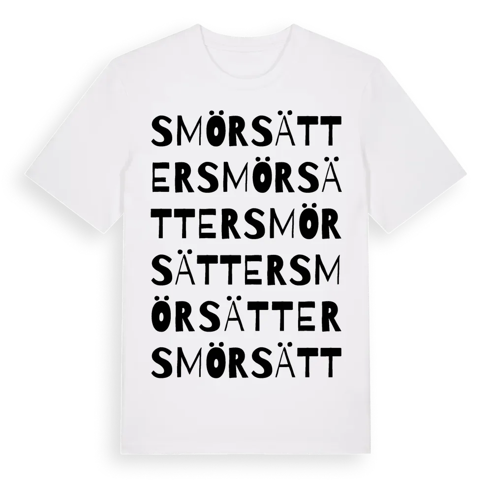 Smörsätter ordlek t-shirt är inspirerad av Smörsätter i Södermanlands län, Sverige. Tröjan är designad för dig som har en speciell koppling till platsen – oavsett om du bor här, har rötterna här eller bara älskar Smörsätter.
