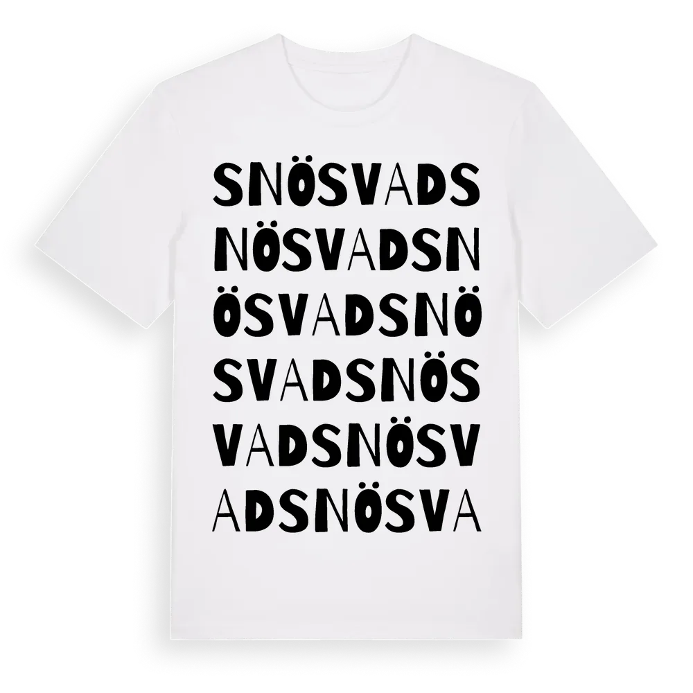 Snösvad ordlek t-shirt är inspirerad av Snösvad i Södermanlands län, Sverige. Tröjan är designad för dig som har en speciell koppling till platsen – oavsett om du bor här, har rötterna här eller bara älskar Snösvad.