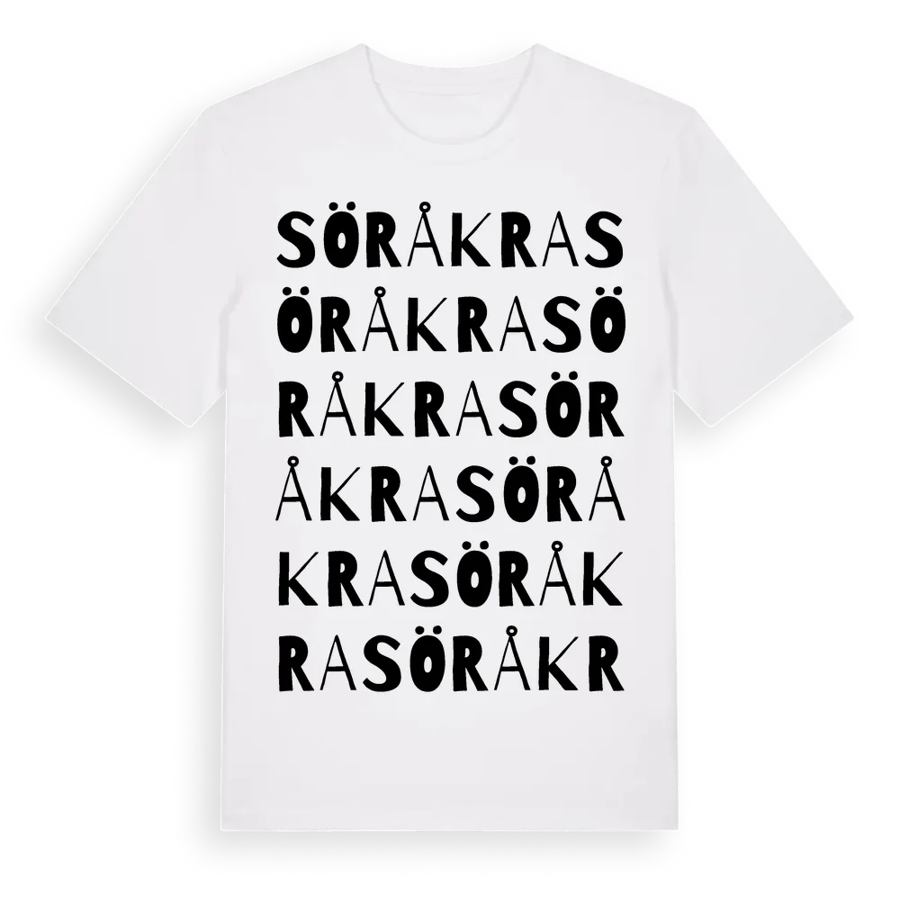 Söråkra ordlek t-shirt är inspirerad av Söråkra i Södermanlands län, Sverige. Tröjan är designad för dig som har en speciell koppling till platsen – oavsett om du bor här, har rötterna här eller bara älskar Söråkra.