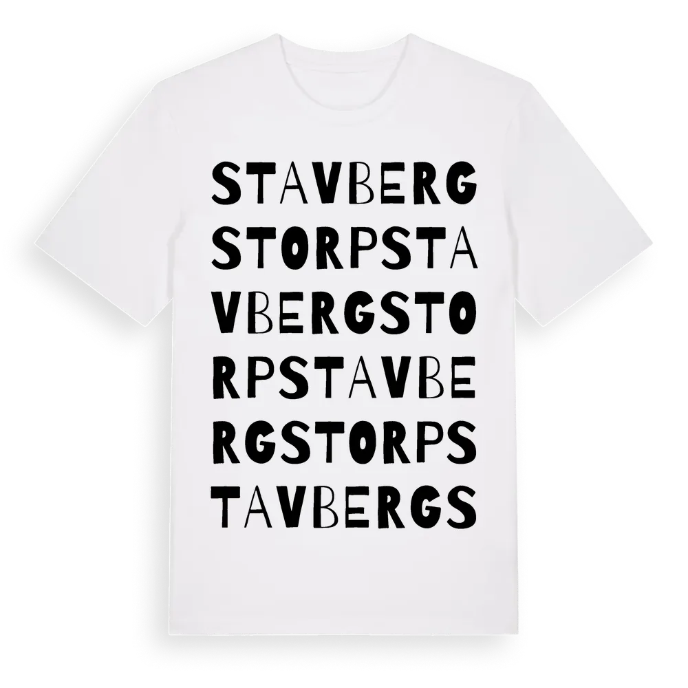 Stavbergstorp ordlek t-shirt är inspirerad av Stavbergstorp i Södermanlands län, Sverige. Tröjan är designad för dig som har en speciell koppling till platsen – oavsett om du bor här, har rötterna här eller bara älskar Stavbergstorp.