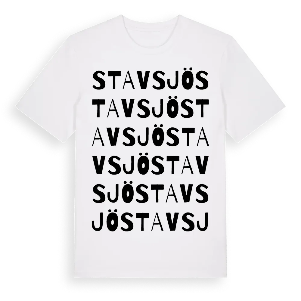Stavsjö ordlek t-shirt är inspirerad av Stavsjö i Södermanlands län, Sverige. Tröjan är designad för dig som har en speciell koppling till platsen – oavsett om du bor här, har rötterna här eller bara älskar Stavsjö.
