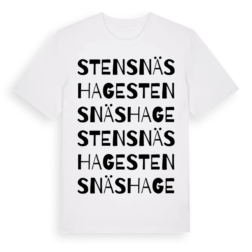 Stensnäshage ordlek t-shirt är inspirerad av Stensnäshage i Södermanlands län, Sverige. Tröjan är designad för dig som har en speciell koppling till platsen – oavsett om du bor här, har rötterna här eller bara älskar Stensnäshage.