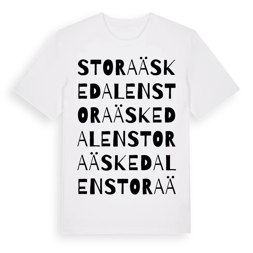 Stora Äskedalen ordlek t-shirt är inspirerad av Stora Äskedalen i Södermanlands län, Sverige. Tröjan är designad för dig som har en speciell koppling till platsen – oavsett om du bor här, har rötterna här eller bara älskar Stora Äskedalen.