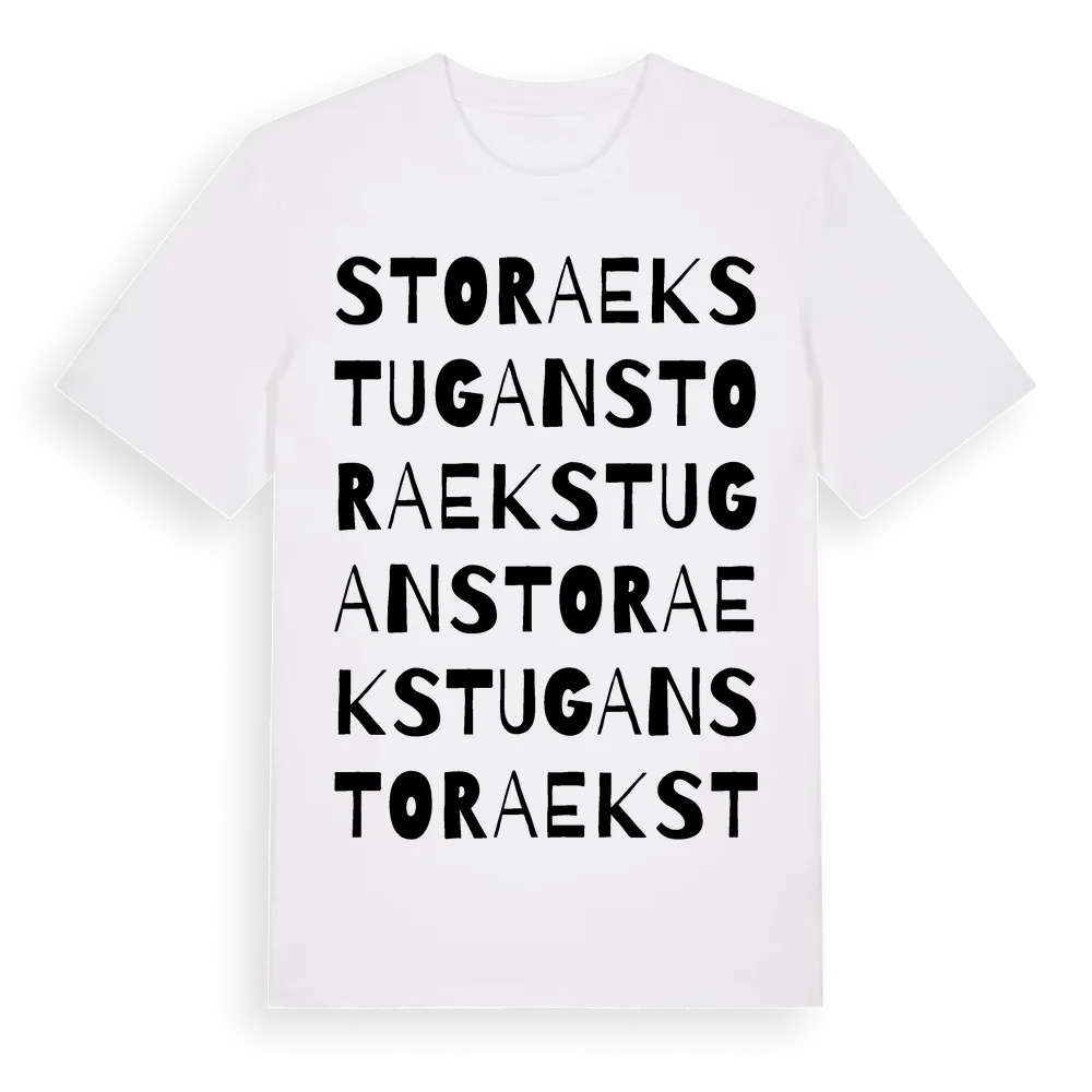 Stora Ekstugan ordlek t-shirt är inspirerad av Stora Ekstugan i Södermanlands län, Sverige. Tröjan är designad för dig som har en speciell koppling till platsen – oavsett om du bor här, har rötterna här eller bara älskar Stora Ekstugan.