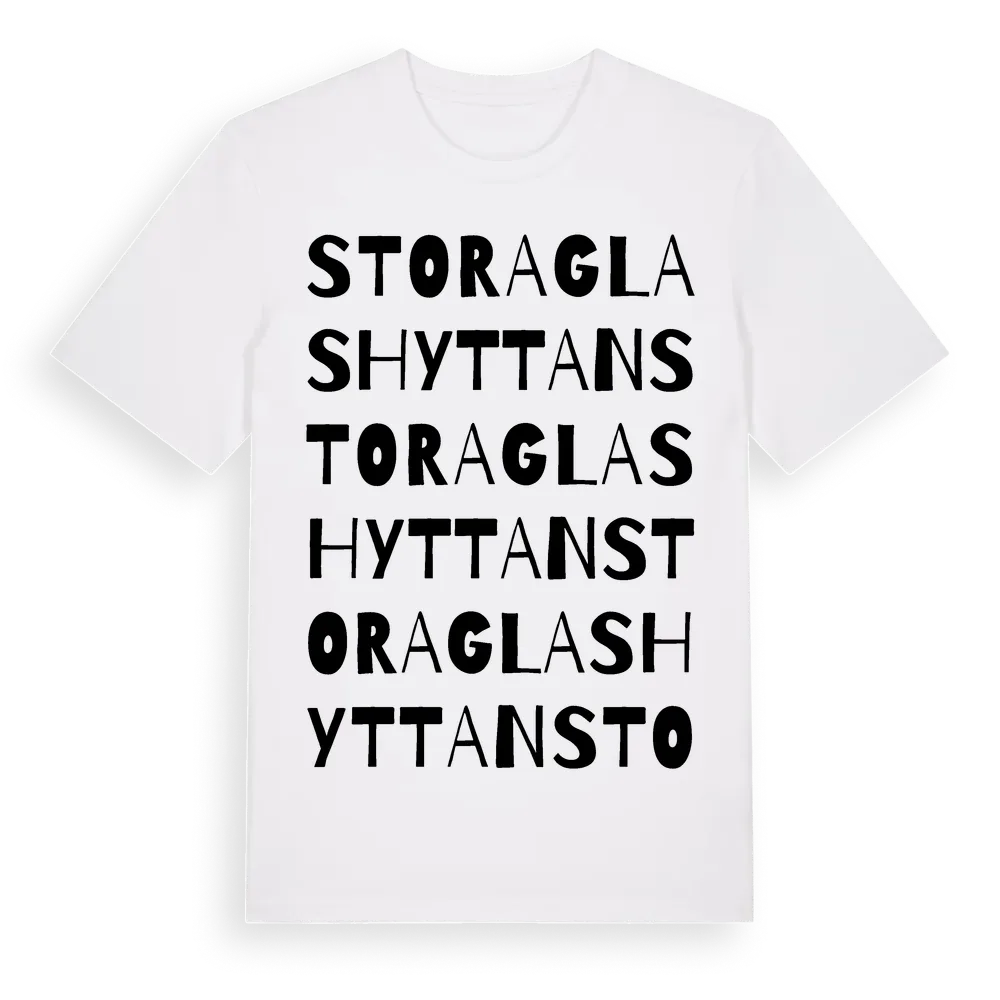 Stora Glashyttan ordlek t-shirt är inspirerad av Stora Glashyttan i Södermanlands län, Sverige. Tröjan är designad för dig som har en speciell koppling till platsen – oavsett om du bor här, har rötterna här eller bara älskar Stora Glashyttan.