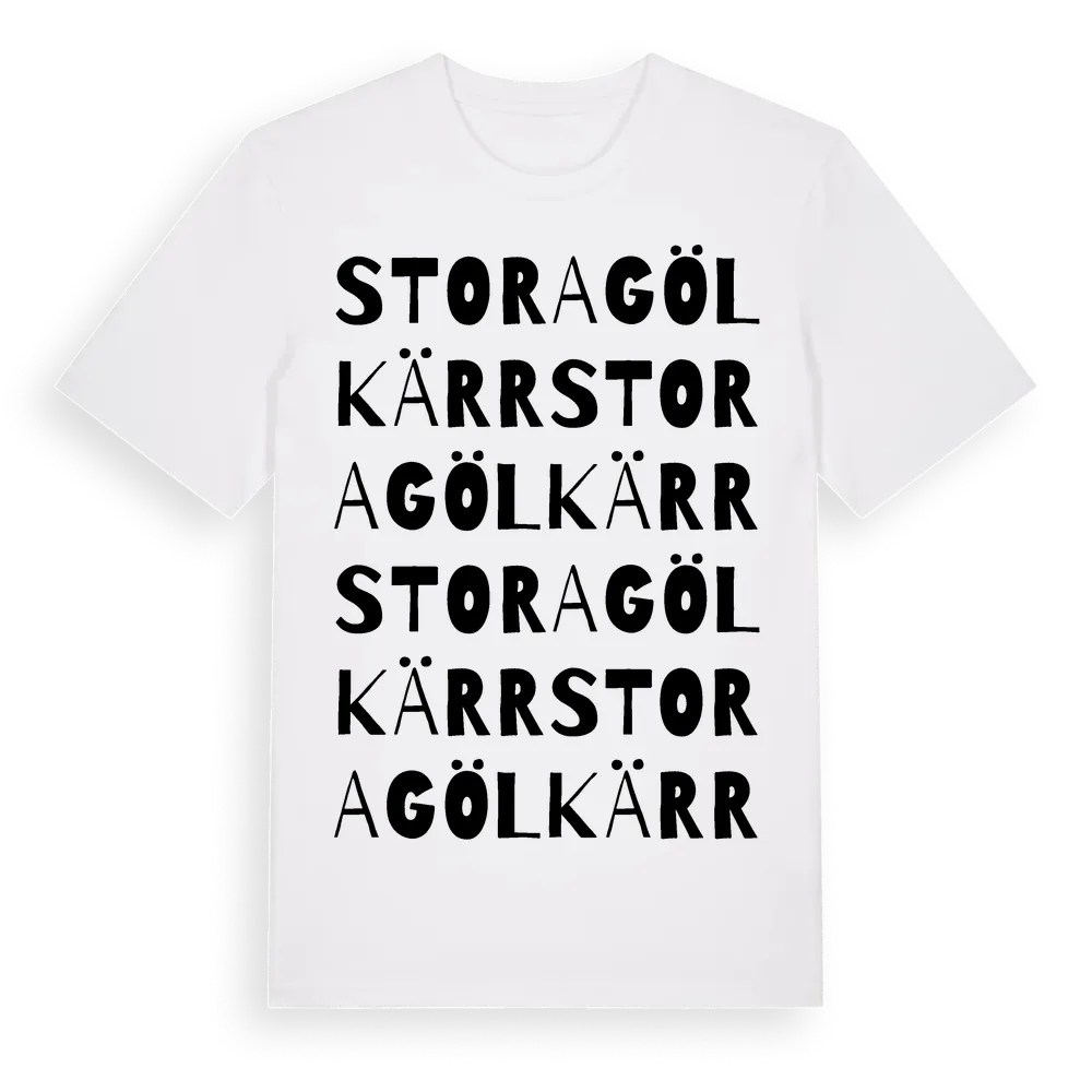 Stora Gölkärr ordlek t-shirt är inspirerad av Stora Gölkärr i Södermanlands län, Sverige. Tröjan är designad för dig som har en speciell koppling till platsen – oavsett om du bor här, har rötterna här eller bara älskar Stora Gölkärr.