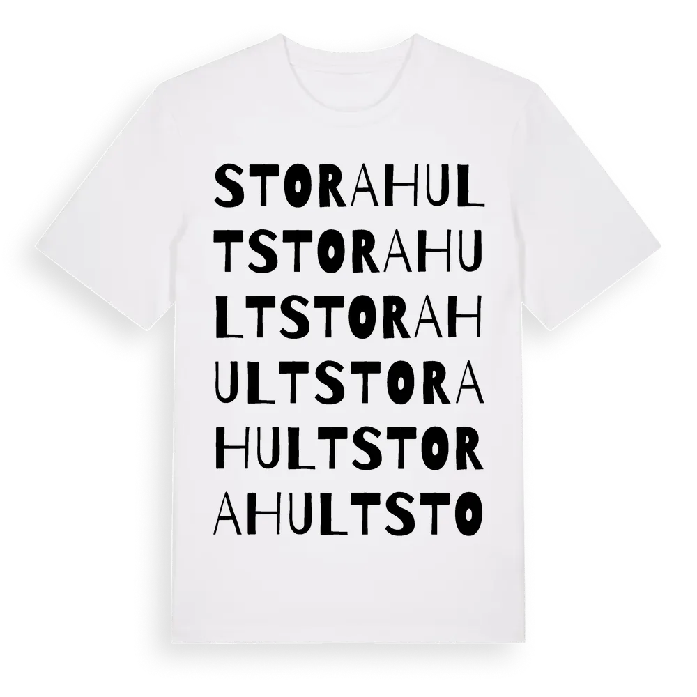 Stora Hult ordlek t-shirt är inspirerad av Stora Hult i Södermanlands län, Sverige. Tröjan är designad för dig som har en speciell koppling till platsen – oavsett om du bor här, har rötterna här eller bara älskar Stora Hult.